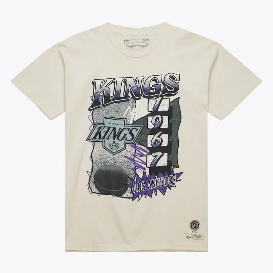 Men's T-Shirt Mitchell & Ness Natural Los Angeles Kings Vintage Hockey Overspray T-Shirtmade of high quality cotton in cream color with gray and purple accents and dedicated to the Los Angeles Kings team. A classic fit T-shirt with the Mitchell & Ness logo will complement your retro style.