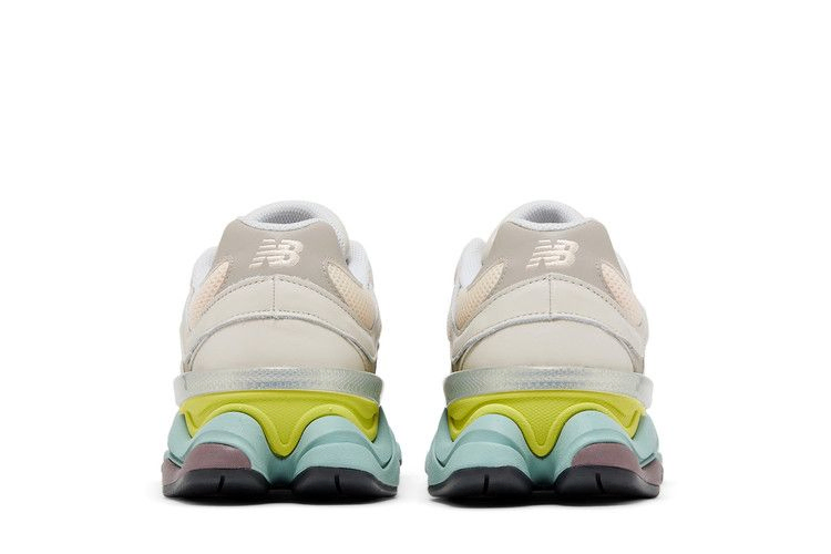 The New Balance 9060 "Moonbeam Vintage Rose" features a neon green and bright aqua blue ABZORB midsole that features a translucent CR overlay in the heel for added stability. The dark gray diamond-patterned rubber outsole provides reliable traction. A cream mesh upper is reinforced with pale gray leather overlays and accented with a soft teal side 'N' logo.