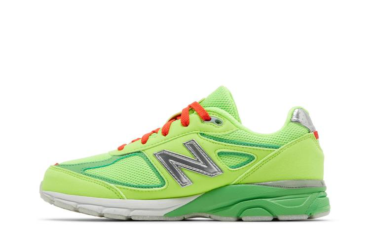 DTLR x New Balance 990v4 Big Kid "Festive" features red laces against a neon green upper constructed of breathable mesh and suede. Metallic silver accents shine on the 'N' logo and heel. The inside of the shoe features New Balance branding with snowflakes and Christmas tree graphics on the toe box. The shoe sits atop a two-tone ENCAP midsole with lightweight foam cushioning and a durable polyurethane rim.