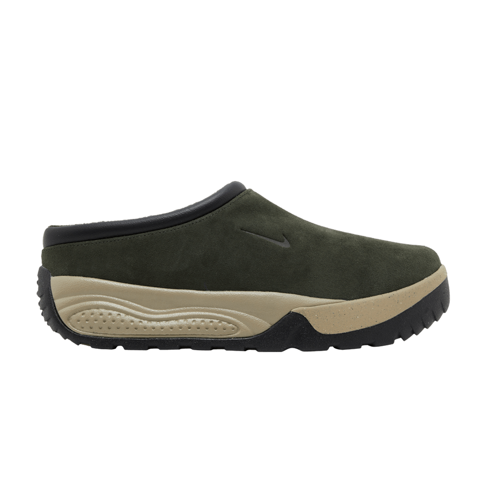 The Nike ACG Rufus 'Sequoia' features a minimalistic suede upper in a muted green colorway. The slip-on silhouette features a leather collar and an embossed mini Swoosh on the side. The inscription "All Conditions Gear" is embossed on the toe box. Lightweight cushioning is provided by a light brown polyurethane foam midsole, which is supported by a knurled rubber outsole at the toe and heel.