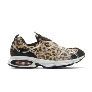 Nike Air Kukini SE "Leopard" puts a retro twist on the 2000 model designed by Sean McDowell assisted by triathlete Mark Allen, with a twist on the wild side. Black leopard spots print adorns the tan stretch mesh upper, complemented by black synthetic suede overlays at the toe and heel. Instead of traditional laces, a translucent web-like support system provides a secure fit. The insole is secured with a soft Phylon sole, and in the heel there is a kumquat-colored Max Air unit.