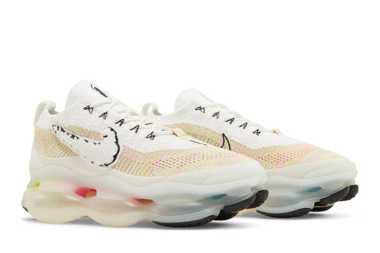 The Nike Air Max Scorpion "Air Max Day" is a special edition running shoe for an active lifestyle as part of Nike's 2023 celebration, which will take place on March 26th. The upper combines multicolored flyknit with white chenille detailing on the collar, tongue and furry side Swoosh. A cartoon eye peeks out from the tongue, while each sock features an Air Max Day-themed graphic. At the heart of the sneaker is a chunky Air midsole, its bulbous proportions highlighted by internal splashes of color in yellow and pink.