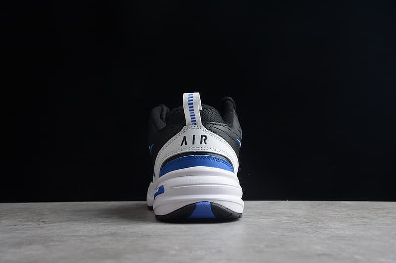 The Nike Air Monarch IV "Black Blue" uses a simple color scheme that complements the clean lines of the sneaker. The sneaker's full leather upper features a crisp white base with contrasting black overlays and bold blue hits on the tongue, Swoosh and toe. The white midsole features a full-length Air-Sole unit for lightweight cushioning, while the multi-layer rubber outsole provides durable traction.