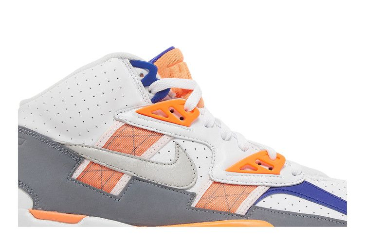 The 2023 release of the Nike Air Trainer SC High "Auburn" takes us back to the '90s sneaker designed by Tinker Hatfield and made famous by Bo Jackson. Featuring the signature colors of the athlete's alma mater, the shoe features a white leather upper with orange straps and a royal blue overlay on the forefoot. The neutral gray hue features the Swoosh logo and gray nubuck heel overlay with Nike embossing. Lightweight cushioning is provided by a two-tone polyurethane outsole with a visible Air unit located in the heel.