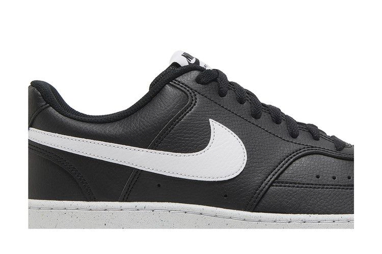 The Nike Court Vision Low Next Nature 'Black White' combines retro basketball style with a rudimentary two-tone palette. Made from 20% recycled content by weight, the low-top sneaker features a black leather upper adorned with a contrasting white Swoosh. Perforated toecaps provide enhanced breathability, while a low, padded collar provides a comfortable fit around the ankle. The sneakers rest on a solid white rubber outsole with a concentric circle pattern on the outsole.