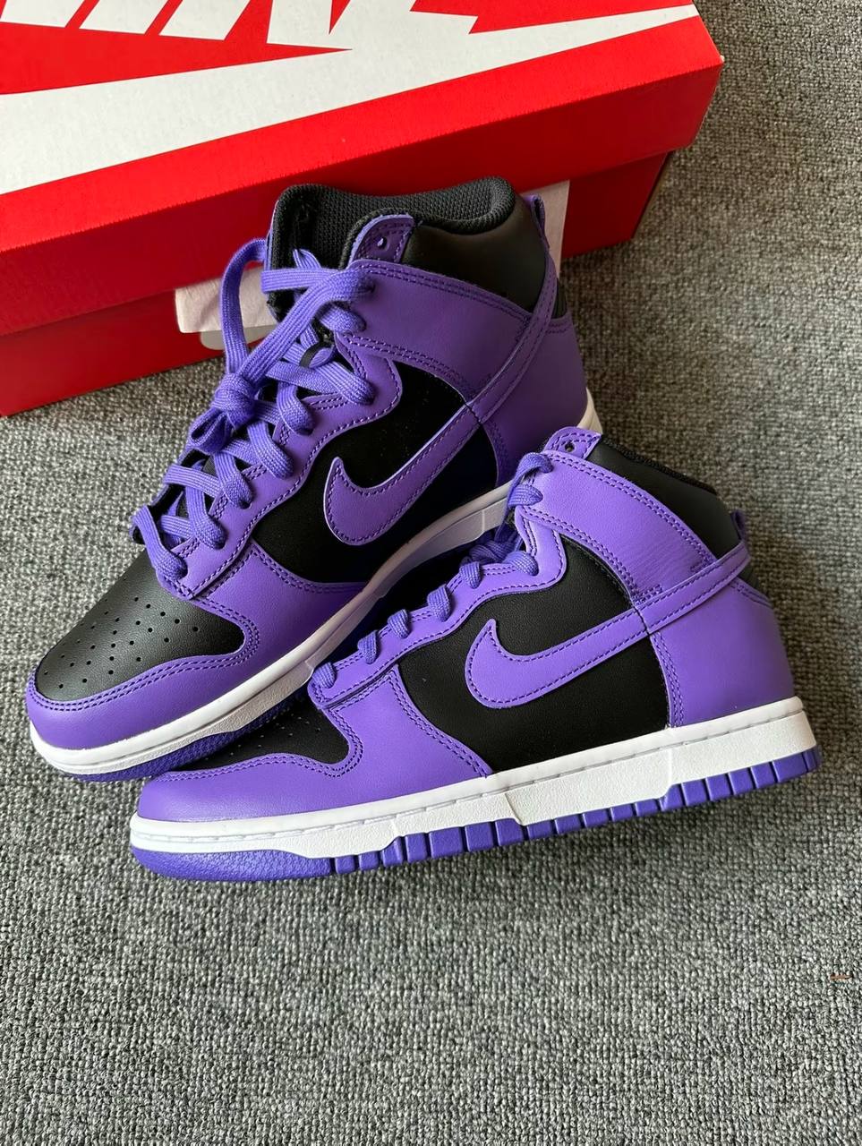 The Nike Dunk High Psychic Purple silhouette brings an eye-catching pop of color to the retro shoe. The upper is crafted from smooth leather and features a crisp black base with contrasting purple overlays. The same hue is repeated on the signature Swoosh, textile collar lining and durable rubber outsole.