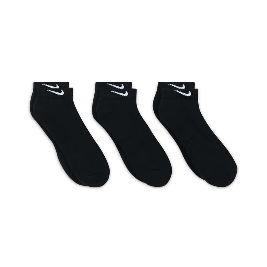 Energize your workout in black socks Nike Everyday Cushioned Training Low Black Socks 3 Pack. The thick terry outsole provides added comfort during leg exercises and insteps, while the ribbed arch wraps around the midfoot for support. Dri-FIT technology helps keep feet dry. Thick terry sole provides comfort and cushioning. Ribbed arch provides support. Low-top silhouette leaves the ankle exposed.