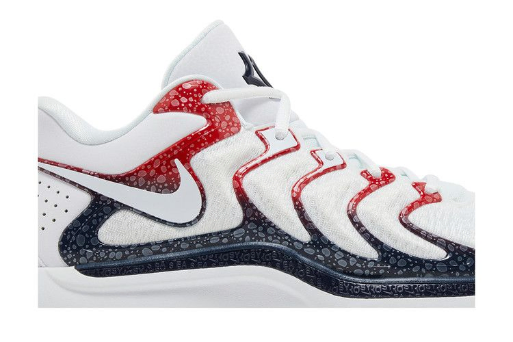 The Nike KD 17 "USA" is a patriotic colorway for the 2024 Summer Olympics in Paris. White knit upper with TPU checkered Safari print in a gradient combination of University Red and Obsidian. Kevin Durant's personal logo adorns the tongue, while Durant's name appears on the leather heel overlay. Cushioning is provided by a lightweight Phylon midsole with a Zoom Air unit in the forefoot and an Air strobel unit in the heel. The sea green rubber outsole has a traction pattern based on a topographic map.