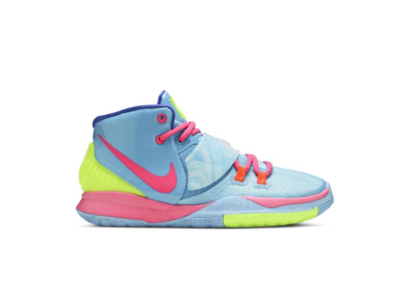 Created with teens in mind, the Nike Kyrie 6 GS "Pool" features a mix of vibrant hues reminiscent of a kid's pool party. Constructed of breathable mesh and shiny patent leather, the upper is finished in a watery blue. An adjustable translucent midfoot strap provides lockdown, while a molded heel counter supports the Achilles.