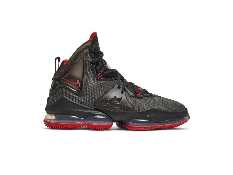 Nike LeBron 19 EP "Bred" is LeBron James' signature shoe, made in the current two-tone color scheme. Like its predecessor, the silhouette is designed by James Petrie and features a hybrid cushioning system that provides both responsiveness on the court and a soft landing. The forefoot Zoom Air unit is paired with a dual-chamber Max Air unit under the heel, both units are bolstered by a Crimson rubber outsole. The upper features a black synthetic textile with TPU overlays along the midfoot and heel. Contrasting scarlet accents feature throughout the sneaker's branding, including the King James Crown logo on the tongue and integrated Flywire cables for a secure fit.