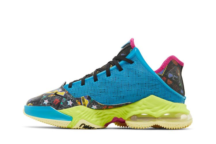 The Nike LeBron 19 Low "LeBronival" features a vibrant color scheme that highlights the sneaker's holiday theme. LeBron James' signature low-top sneaker features a breathable mesh overlay in a vibrant aquatic hue, contrasted by a multi-color carnival print on the tongue, collar and toe. Lightweight cushioning is provided by a React foam midsole in Citron Tint, while the lateral wall features a fuchsia Swoosh and an oversized Max Air unit located under the heel.