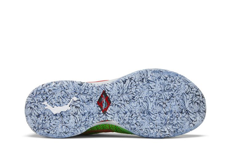 The Nike LeBron 20 "Stocking Stuffer" is a festive two-tone colorway. LeBron James' 20th signature sneaker features a mesh material with bright green detailing and contrasting red fibers. Additional crimson hits the heel counter, Swoosh and LJ badge on the heel. The performance-enhancing material features a lightweight Cushlon midsole that features a loaded Air Zoom Turbo unit in the forefoot and a larger Zoom Air unit in the heel. A carbon fiber shank plate provides midfoot support, while a synthetic-covered lateral guard provides increased stability. The translucent rubber outsole features a Christmas holly print.