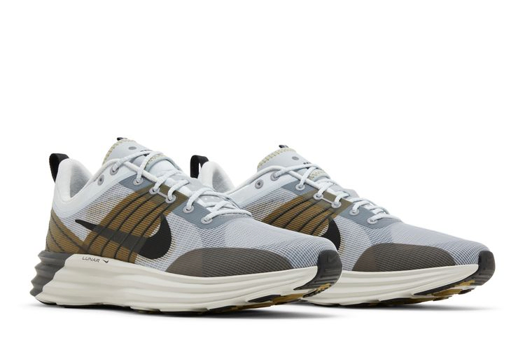 The Nike Lunar Roam "Pure Platinum" brings earthy accents to a running shoe built with Lunar cushioning, a lightweight foam Nike first introduced in 2008. The high-height midsole is supported by durable rubber pods. The upper features a light gray mesh with Magwire cables that provide lightweight support in the midfoot and heel. They are finished with Desert Moss synthetic overlays. The insoles on the heel are decorated with reflective details for improved visibility in low light conditions.