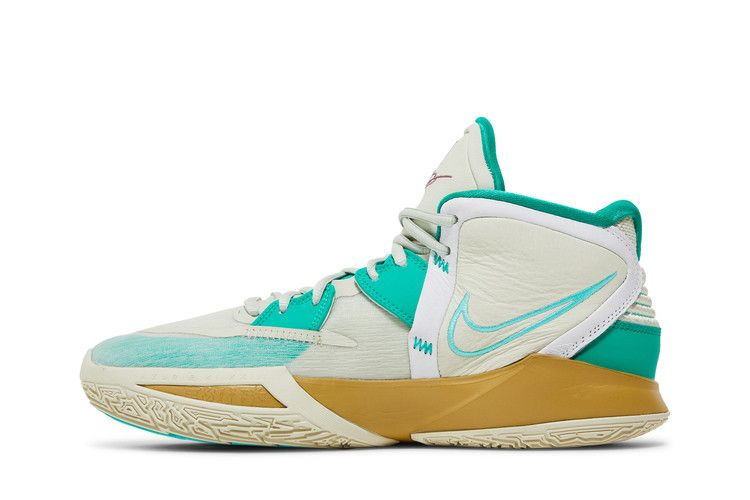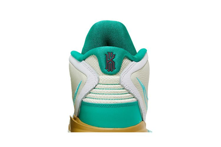 The Nike Kyrie Infinity 'Golden Tribute' brings back a familiar theme from previous iterations of Kyrie Irving's signature sneaker: recognizing WNBA star Sue Bird. Her professional accomplishments, as well as her "look good, feel good, play good" attitude, inspire the "Keep Sue Fresh" slogan, which is featured on the left tongue of the shoe. The sneaker features an ivory textile upper with tonal leather trim and emerald accents. The Phylon midsole is complemented by a springy Zoom Air unit in the forefoot and features a dull gold finish.