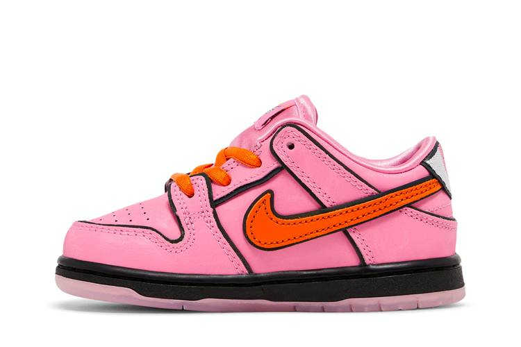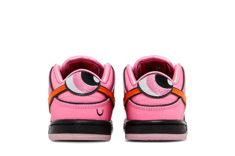 Releasing as part of The Powerpuff Girls' footwear collection, the Nike Dunk Low Pro SB QS TD 'Blossom' is inspired by the trio's fearless leader and features a Pink leather upper with a contrasting Orange Swoosh. Unique details include reflective trim, satin lining inside, and embroidered Blossom eyes on each heel tab. The sneaker sits atop a solid black midsole, which is supported by a translucent rubber outsole with a pink tint.