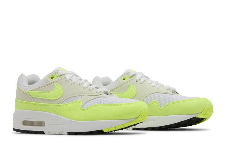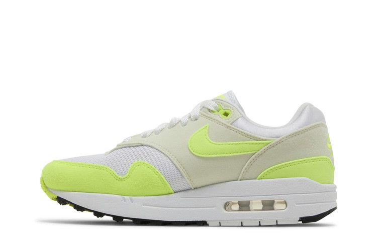 The Nike Air Max 1 "Volt" Women's Shoe features a Bright Yellow color scheme paired with breathable White mesh and a sea glass synthetic suede overlay. The latter is completed with Volt's signature Swoosh logo matching the mudguard and embroidered Nike Air branding adorning the rear heel. A classic white finish is applied to the lightweight polyurethane midsole with a visible Air unit in the heel for comfortable movement.