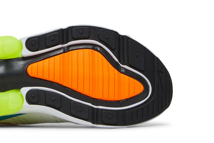 The Nike Air Max 270 "Summit White Volt" Women's Shoe features a snug, sock-like fit with ultra-soft cushioning. The stretchy white mesh upper features perforations and a vibrant blue textile heel overlay. Contrasting orange adorns the padded collar and trim. The midsole combines soft foam in the forefoot with a voluminous Max Air unit in the heel, finished in Nike's signature Volt hue for maximum visual impact.