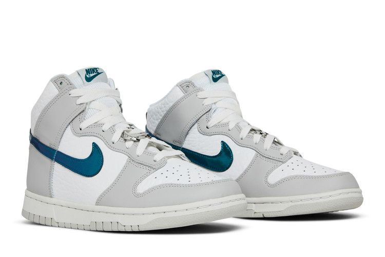 The Nike Dunk High 'FLS' Women's Shoe brings sparkling accents to a sports shoe that has become a staple of street fashion. The sneaker features a White leather upper with Matte Gray leather overlays on the toe and heel. The sneaker's neutral palette is complemented by pops of emerald, highlighted by the Nike woven tongue and shiny metallic Swoosh. A second Swoosh appears on the chrome lace adornment. The sneakers are based on a standard rubber sole, the white sidewalls of which are combined with a gray rubber outsole.