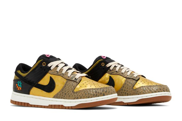 The Nike Dunk Low Women's "Día De Muertos" is taken from the Day of the Dead shoe collection. The metallic gold leather upper is finished with a subtle brushstroke texture, while the toe box features a scaly tan leather overlay. Contrasting black accents are found on the suede Swoosh, textured leather heel overlay and breathable nylon tongue. Along with pink Nike branding on the tongue and heel, an embroidered hummingbird graphic on the lateral heel adds a pop of color. The rubber sole provides reliable grip on the surface.