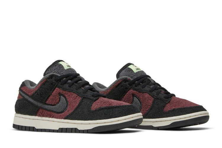 The Nike Dunk Low SE "Burgundy Crush" Women's Sneaker is a cozy remake of the traditional sneaker. Instead of the standard leather material, the two-tone upper features plush fleece in Burgundy and Black. Dark Smoke Gray accents appear on the Swoosh, collar lining and tongue, while the woven tag features updated Nike branding. The vintage midsole is finished in white and backed by a black high-traction rubber outsole.