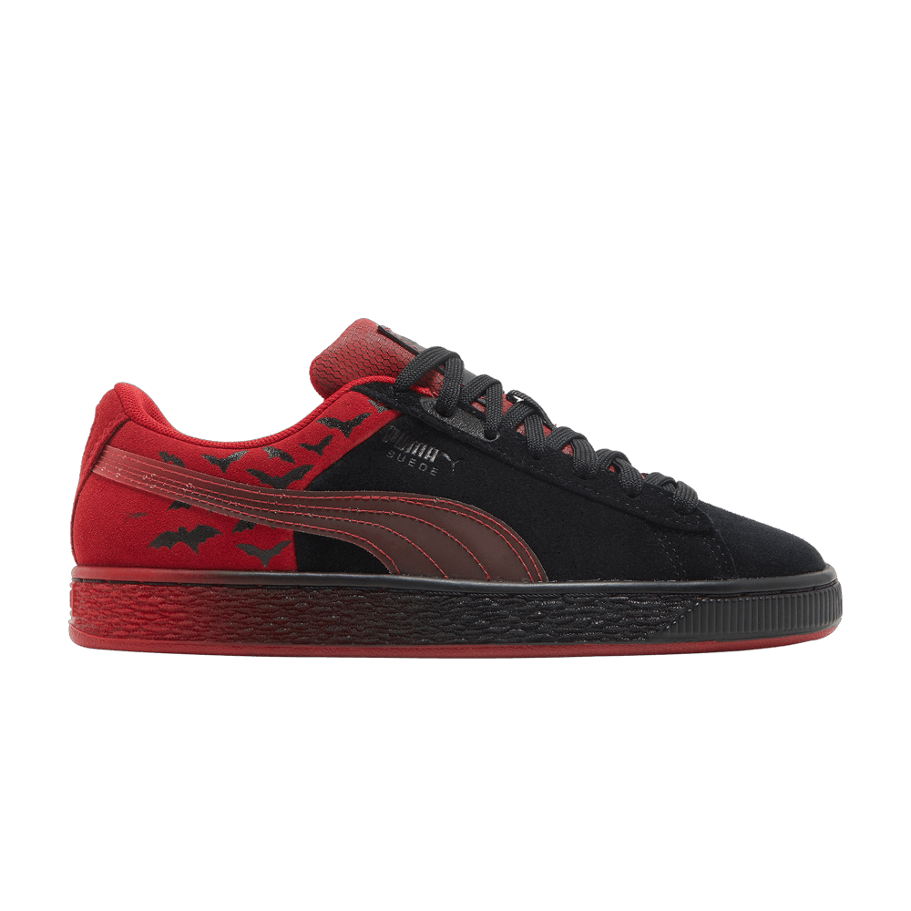 Releasing as part of a capsule collection to celebrate the 2023 release of The Batman, the PUMA Suede Classic Big Kid "Black Barbados Cherry" features a contrasting two-tone design inspired by the "Winged Crusader". The suede upper features a black and crimson color scheme while a graphic bat print appears on the heel. A Formstrip runs down the side panel, while the tongue features dual Batman and PUMA branding. The sneakers rest on a durable rubber sole with side walls made in a gradient black and red color.