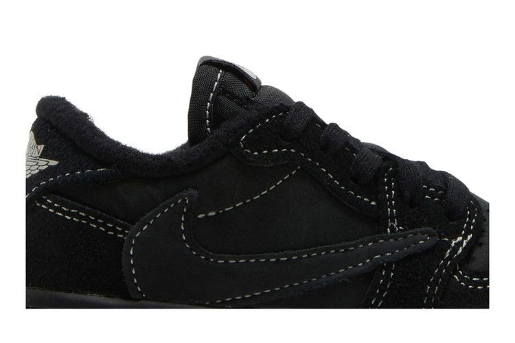 Crafted for little feet, the Travis Scott x Air Jordan 1 Retro Low OG SP TD 'Black Phantom' brings the Houston rapper's signature touches to the tonal colorway of the iconic silhouette. The nubuck and suede upper is finished in a solid black colorway with contrasting white stitching and a large reverse Swoosh on the lateral side. A woven Nike tag adorns the tongue, while the Jordan Wings logo and unique bee graphic appear on the heel. The sneakers rest on a black rubber sole.