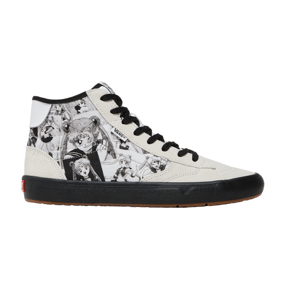 The Sailor Moon x Lizzie Armanto x Vans Women's Skate Sk8-Hi "Pretty Guardian" is a sneaker collaboration that takes dual inspiration from the iconic anime series and the award-winning skateboarder. The upper features crisp white suede overlays free of chrome, as well as textile side panels covered in collage graphics featuring Sailor Moon artwork. "Lizzie Armanto" branding is hidden on the underside of each tongue, while the athlete's "LA" logo is featured on the tongue. The sneakers sit on a low-profile black rubber outsole, which is supported by a rubber outsole with a micro-waffle tread.