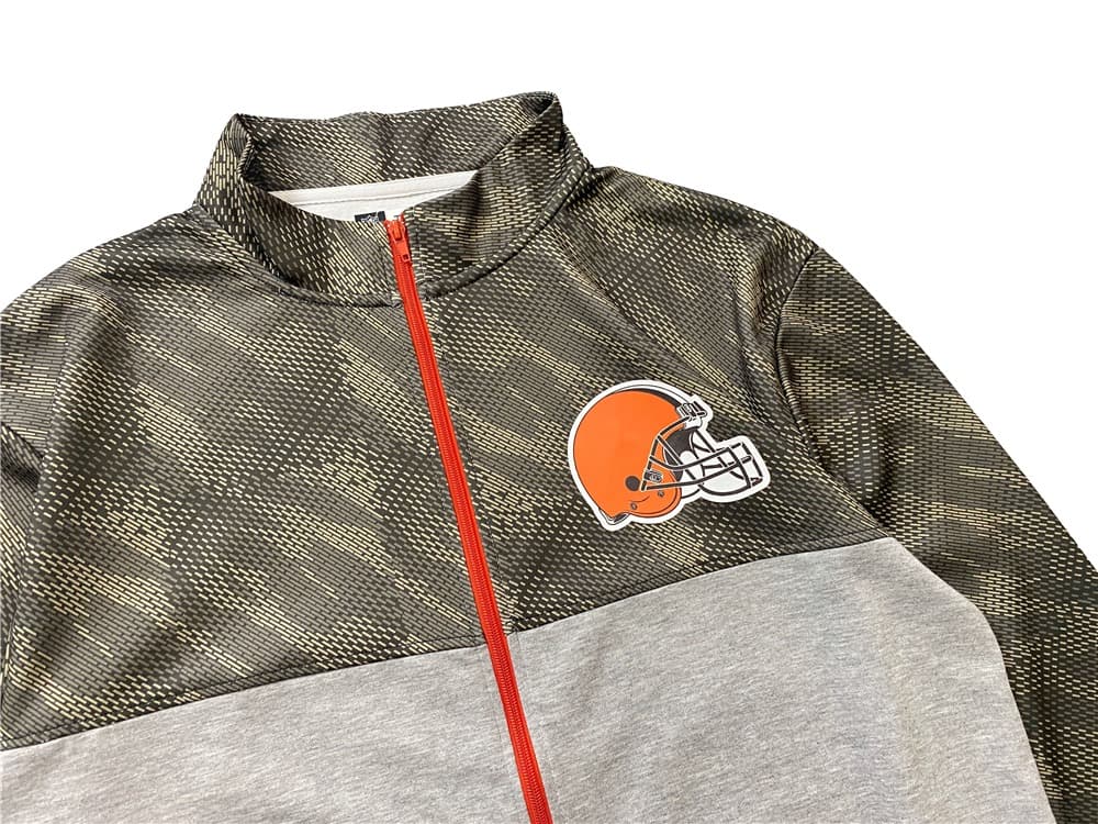 Jacket B20THER NFL Browns Brown The brown jacket has a loose fit with a gray bottom and red accents. The front features a print in the NFL Browns colors, a zip fastening and a stand-up collar. This comfortable jacket is perfect for training, as it does not restrict movement and is made of quick-drying polyester.